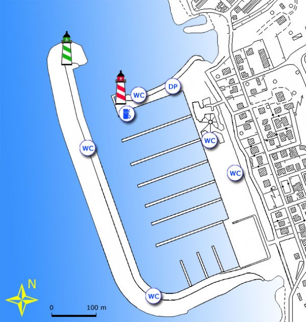 A marinában 650 kikötőhely (8-36m szélességben, 2-6m mélységig), víz- és áramvételi lehetőség.
